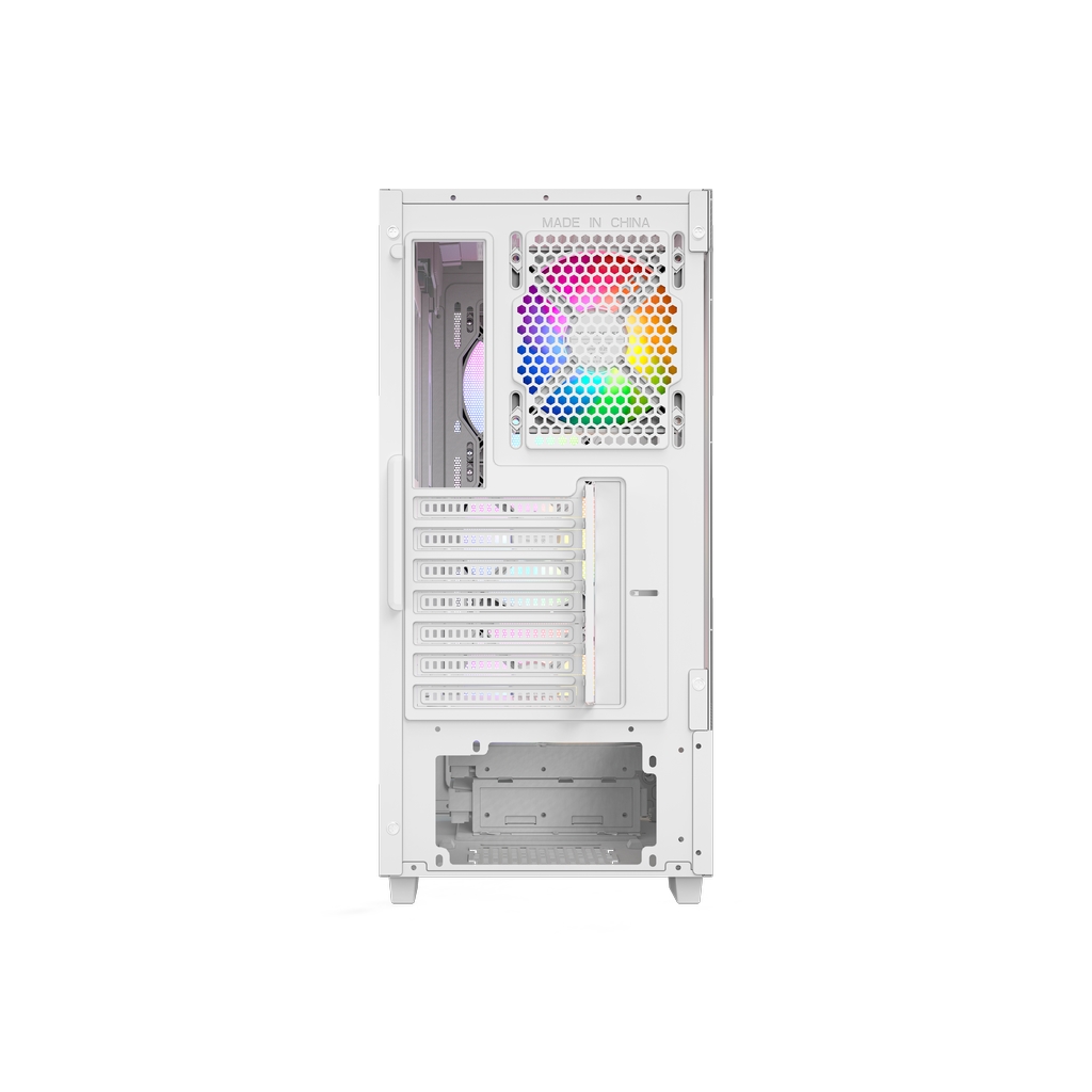 Размеры (ШхВхГ): 216x465x365mm, SPCC 0.45mm.CPU кулер 175мм (макс),VGA 305mm, PSU up to ***mm. Слоты: 3,5"х2, 2,5"х2, 7xPCI. Охлаждение: Front: 3х120мм ARGB fans (inc.). Rear:1х120мм ARGB fan (inc.). I/O Panel: USB3.0 x 1 / USB2.0 x 2 , HD audio.