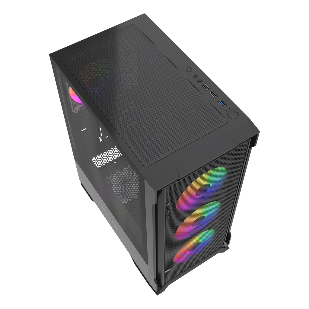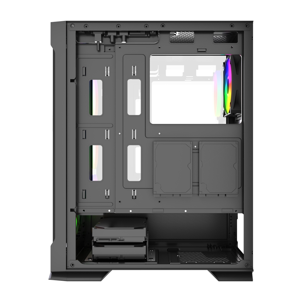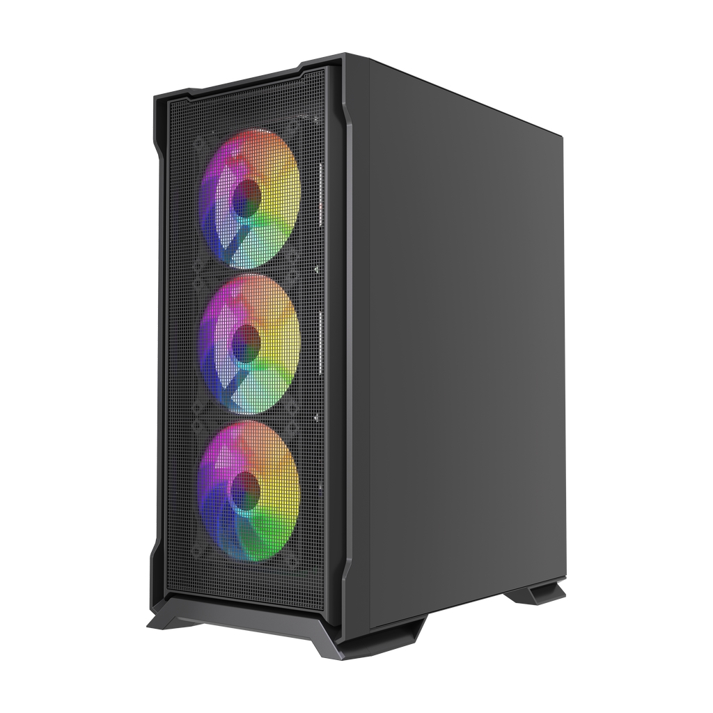 Размеры (ШхВхГ): 216x465x365mm, SPCC 0.45mm.CPU кулер 175мм (макс),VGA 305mm, PSU up to ***mm. Слоты: 3,5"х2, 2,5"х2, 7xPCI. Охлаждение: Front: 3х120мм ARGB fans (inc.). Rear:1х120мм ARGB fan (inc.). I/O Panel: USB3.0 x 1 / USB2.0 x 2 , HD audio.