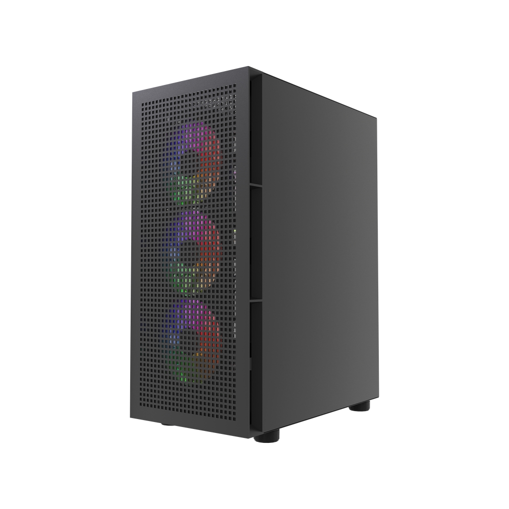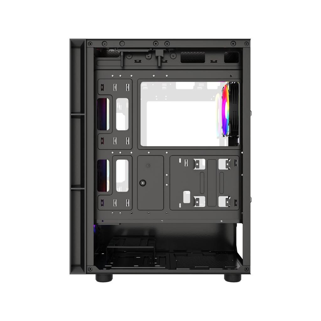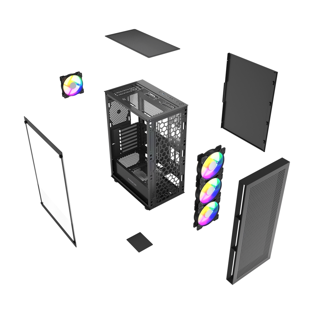 Размеры (ШхВхГ): 212x470x365mm, SPCC 0.45mm.CPU кулер 165мм (макс),VGA 300mm, PSU up to 170mm. Слоты: 3,5"х1, 2,5"х2, 7xPCI. Охлаждение: Front: 3х120мм ARGB fans (inc.). Rear:1х120мм ARGB fan (inc.). I/O Panel: USB3.0 x 1 / USB2.0 x 2 , HD audio.