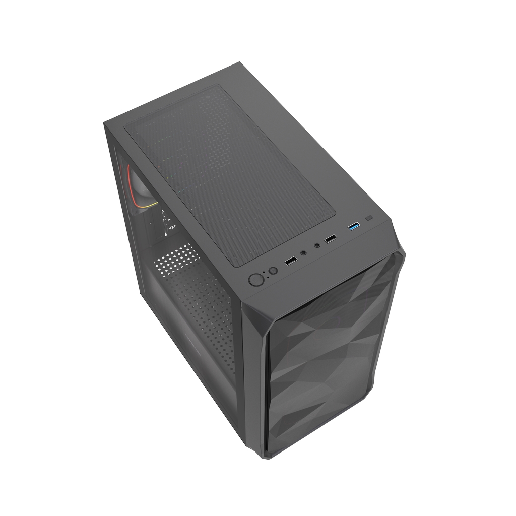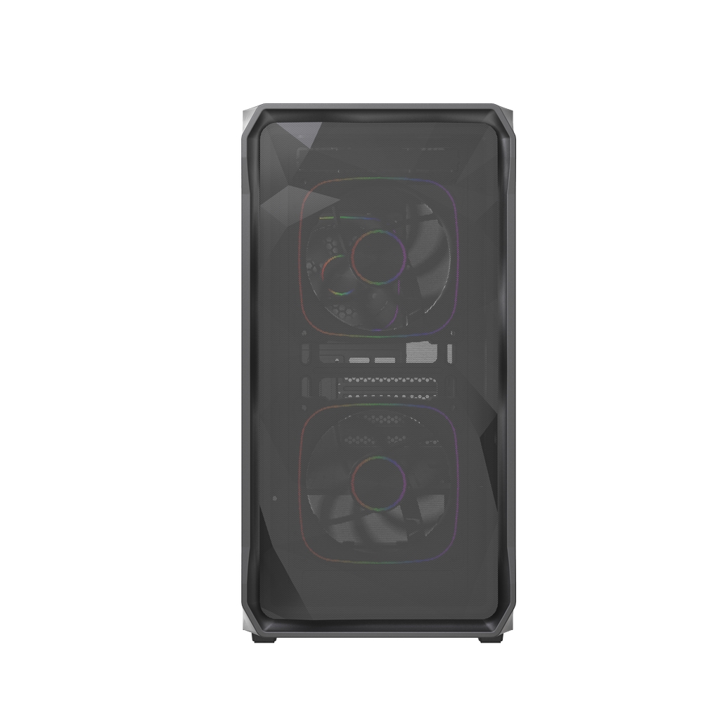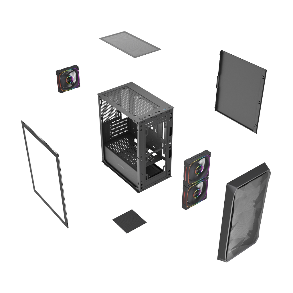 Размеры (ШхВхГ): 195x387x345mm,SPCC 0.45mm.CPU кулер 160мм (макс),VGA 300mm, PSU 160mm. Слоты: 3,5"х1, 2,5"х2, 4xPCI. Охлаждение: Front: 2х120мм ARGB fans (inc.). Top: 2х120мм, Rear: 1х120мм ARGB fan (inc.). I/O Panel: USB3.0 x 1 / USB2.0 x 2 , HD audio.