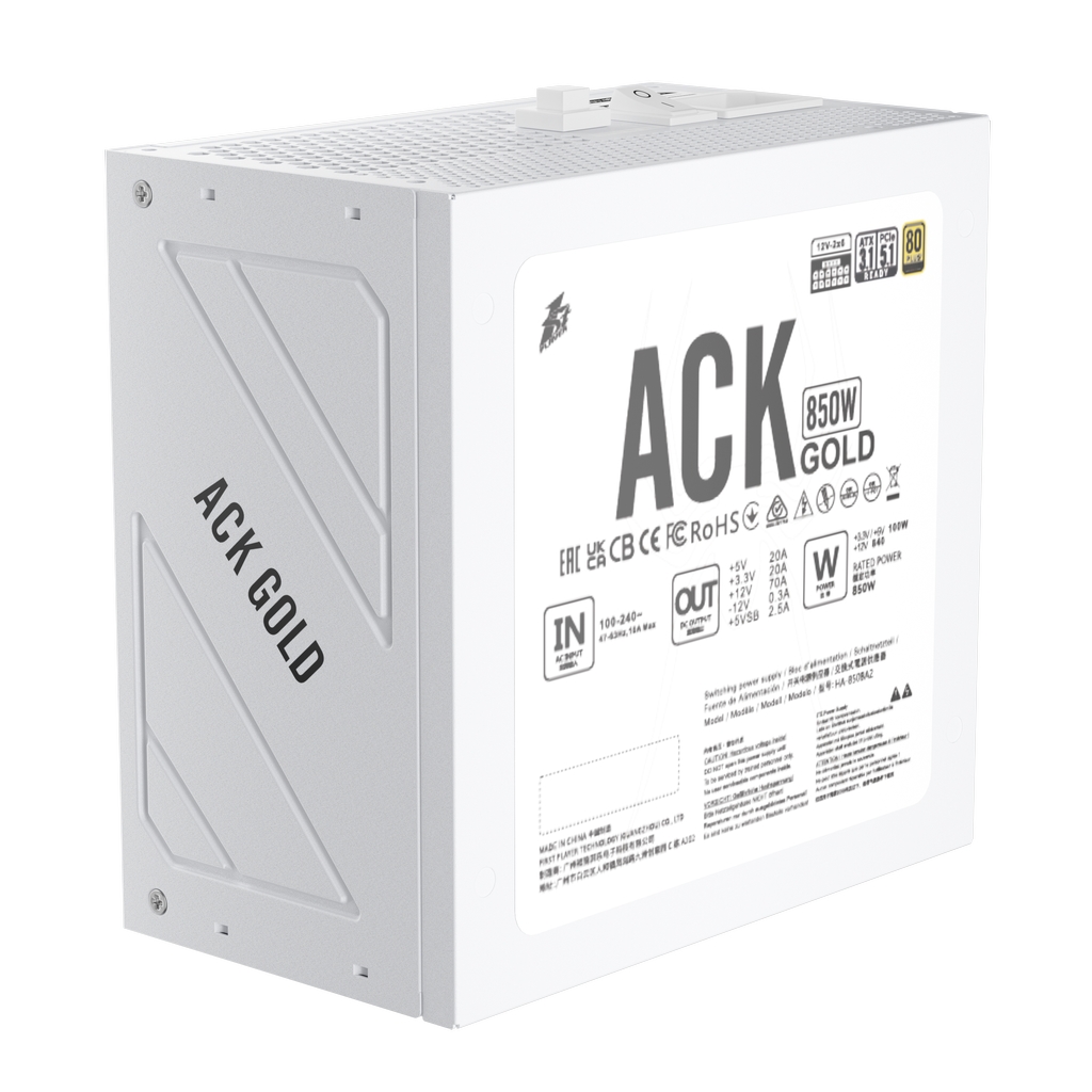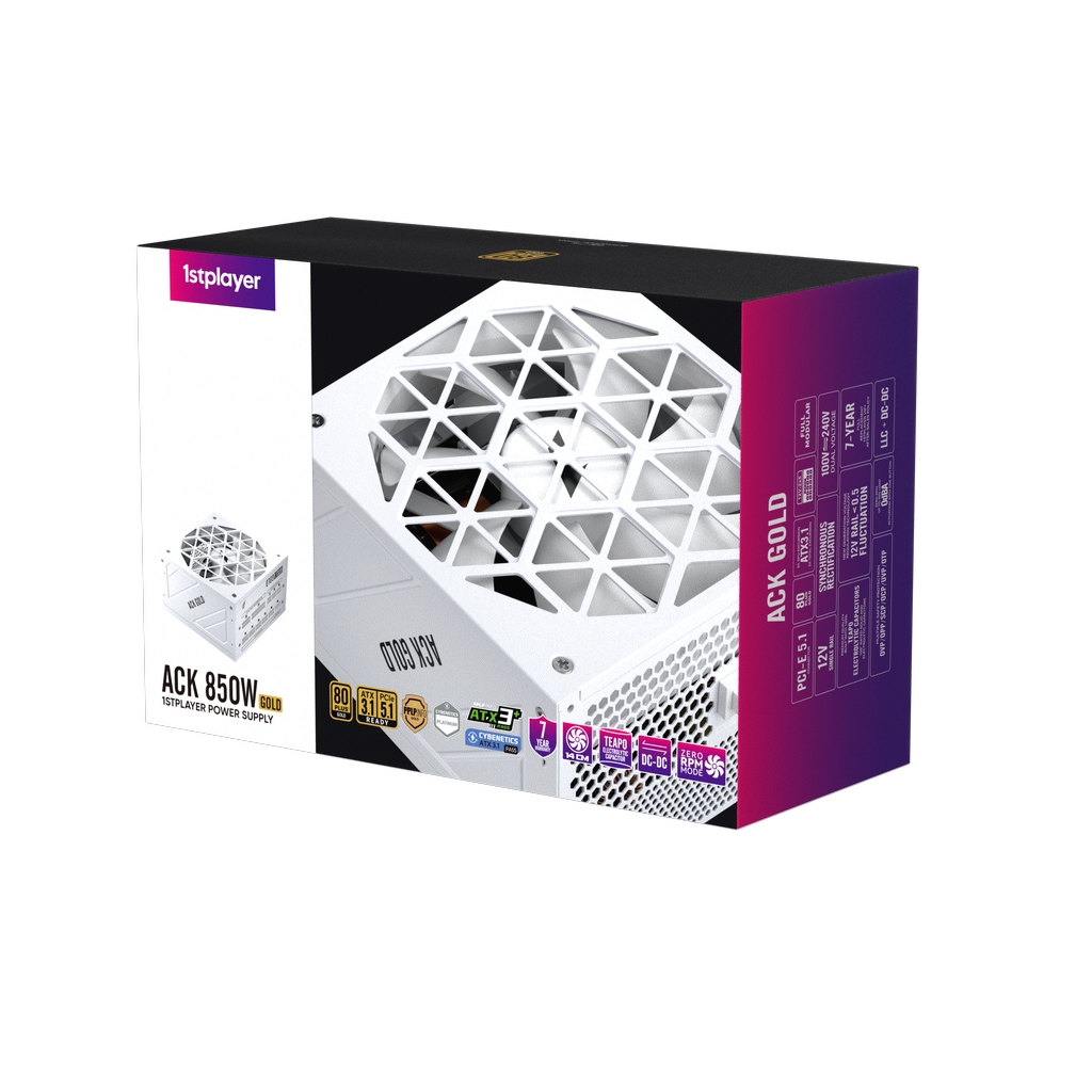 Блок питания 1STPLAYER ACK GOLD 850W White / ATX 3.1, PCle 5.1, APFC, 80 PLUS Gold, LLC+DC-DC, full Teapo caps, 140mm fan, full modular / HA-850BA2-WH
