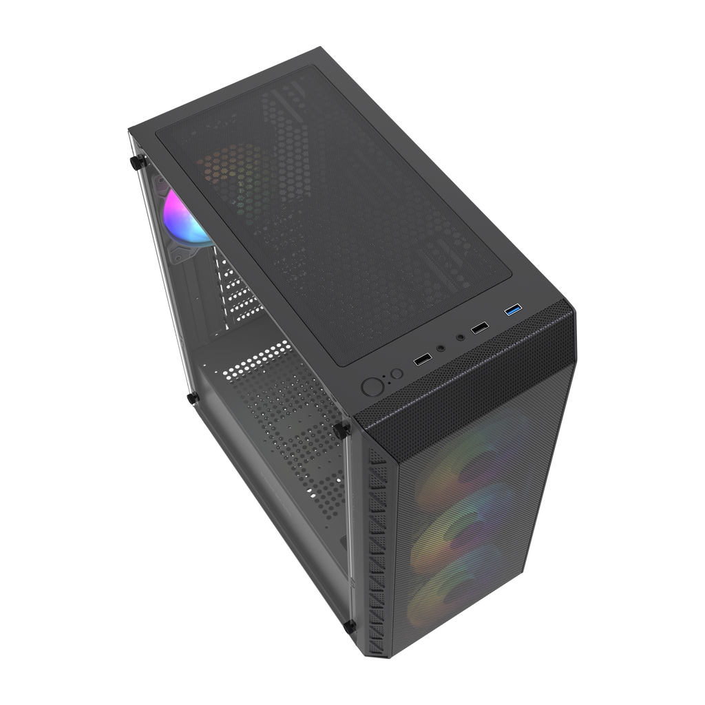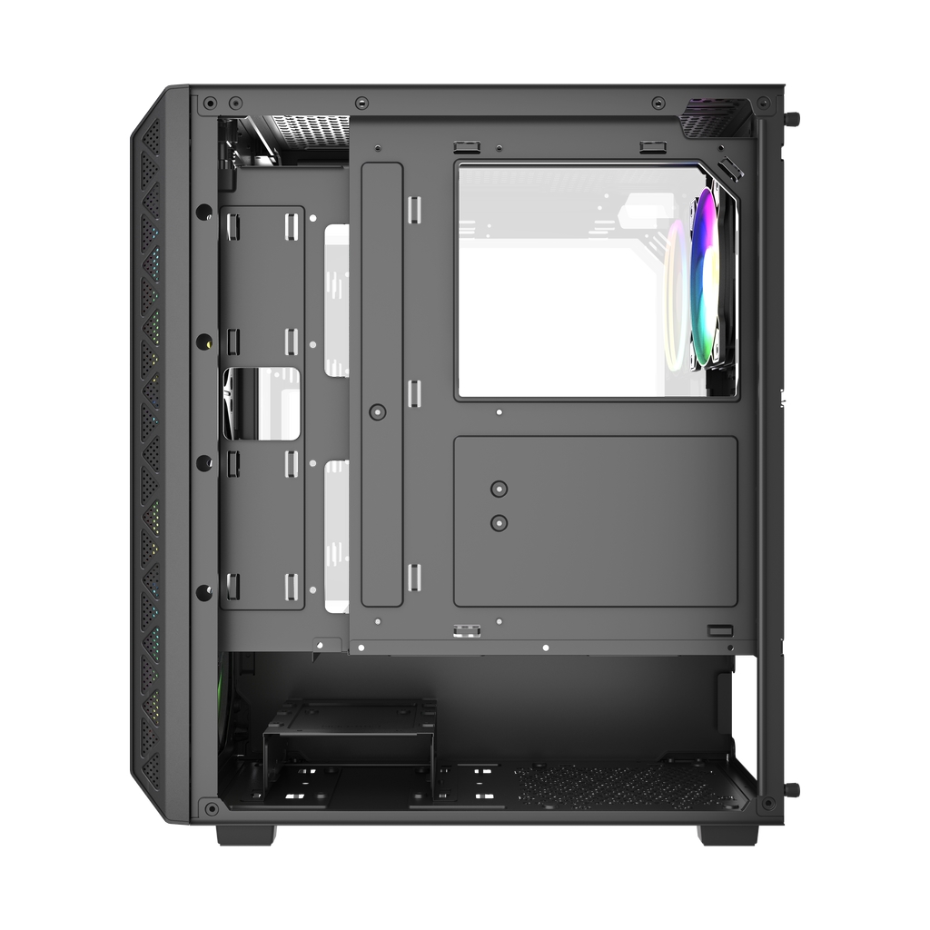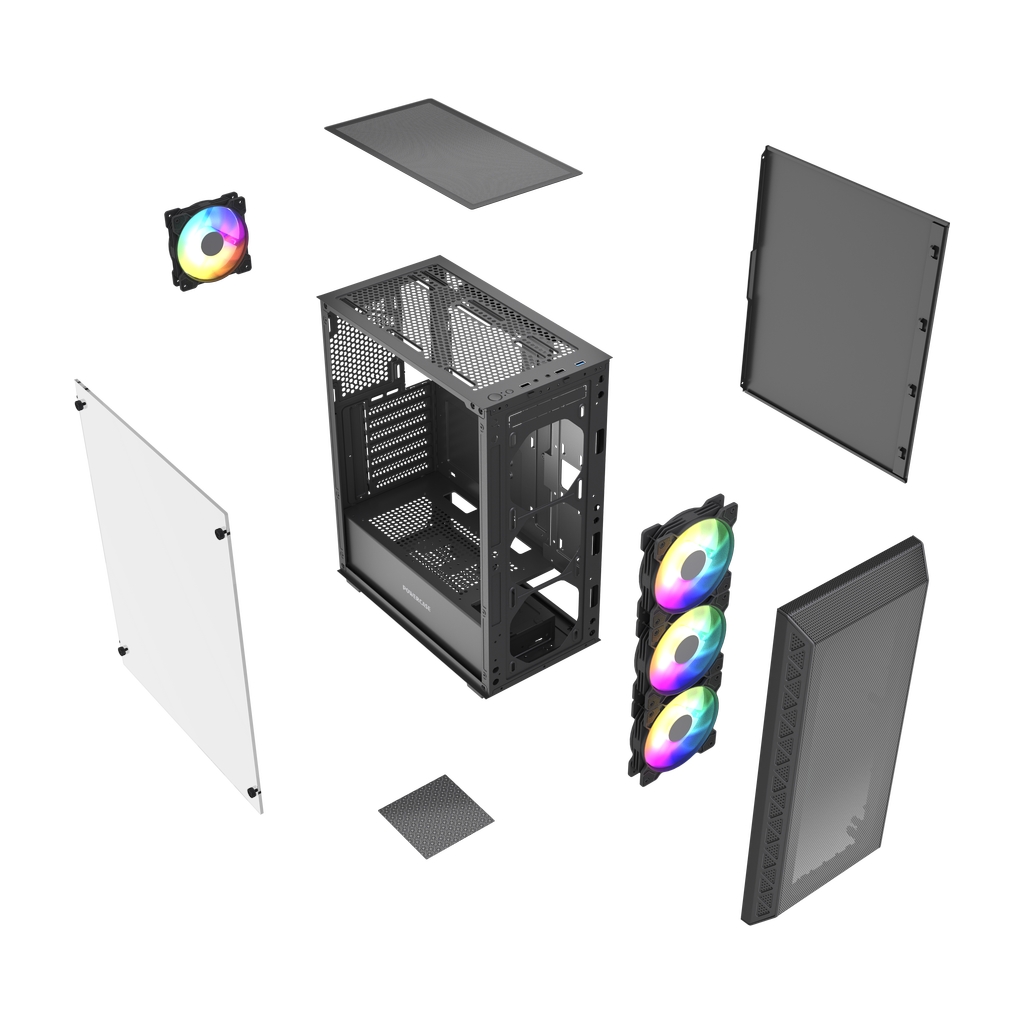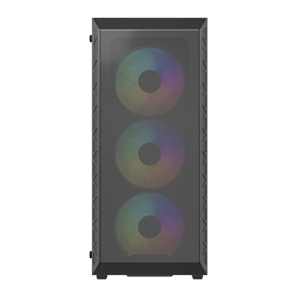 Размеры (ШхВхГ): 195x450x395mm, SPCC 0.45mm.CPU кулер 160мм (макс),VGA 310mm, PSU up to 200mm. Слоты: 3,5"х2, 2,5"х2, 7xPCI. Охлаждение: Front: 3х120мм ARGB PWM fans (inc.). Rear:1х120мм ARGB PWM fan (inc.). I/O Panel: USB3.0 x 1 / USB2.0 x 2 , HD audio.